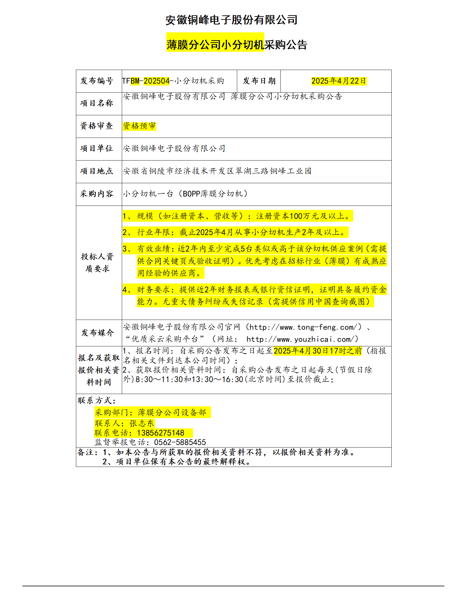 安徽銅峰電子股份有限公司—— 薄膜分公司小分切機(jī)采購(gòu)公告_01