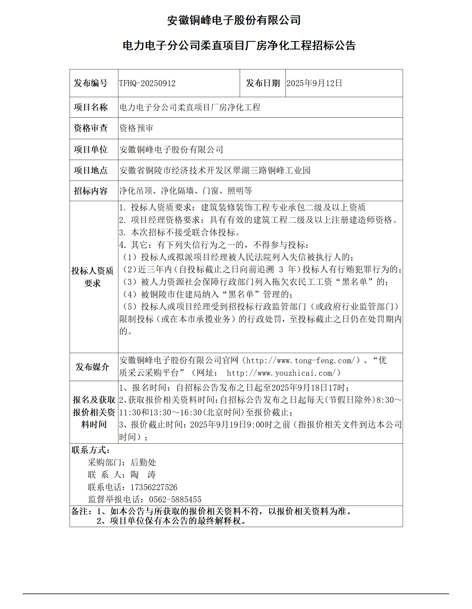 01安徽銅峰電子股份有限公司 (電力電子分公司柔直項(xiàng)目廠房?jī)艋こ?招標(biāo)公告)_01